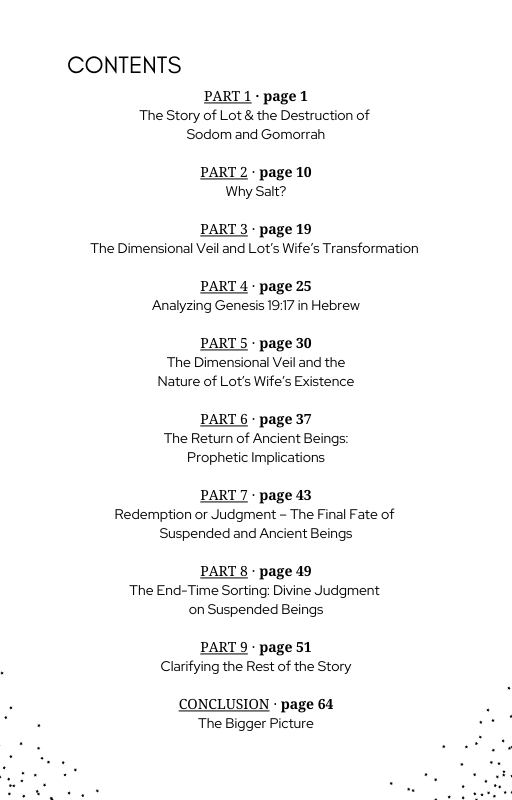 From the true Hebrew meaning of Lot’s wife being “stationed” — not “turned” — into salt, to the thinning of the dimensional veil during divine judgment, this book uncovers the spiritual physics of choice, longing, and ascension.